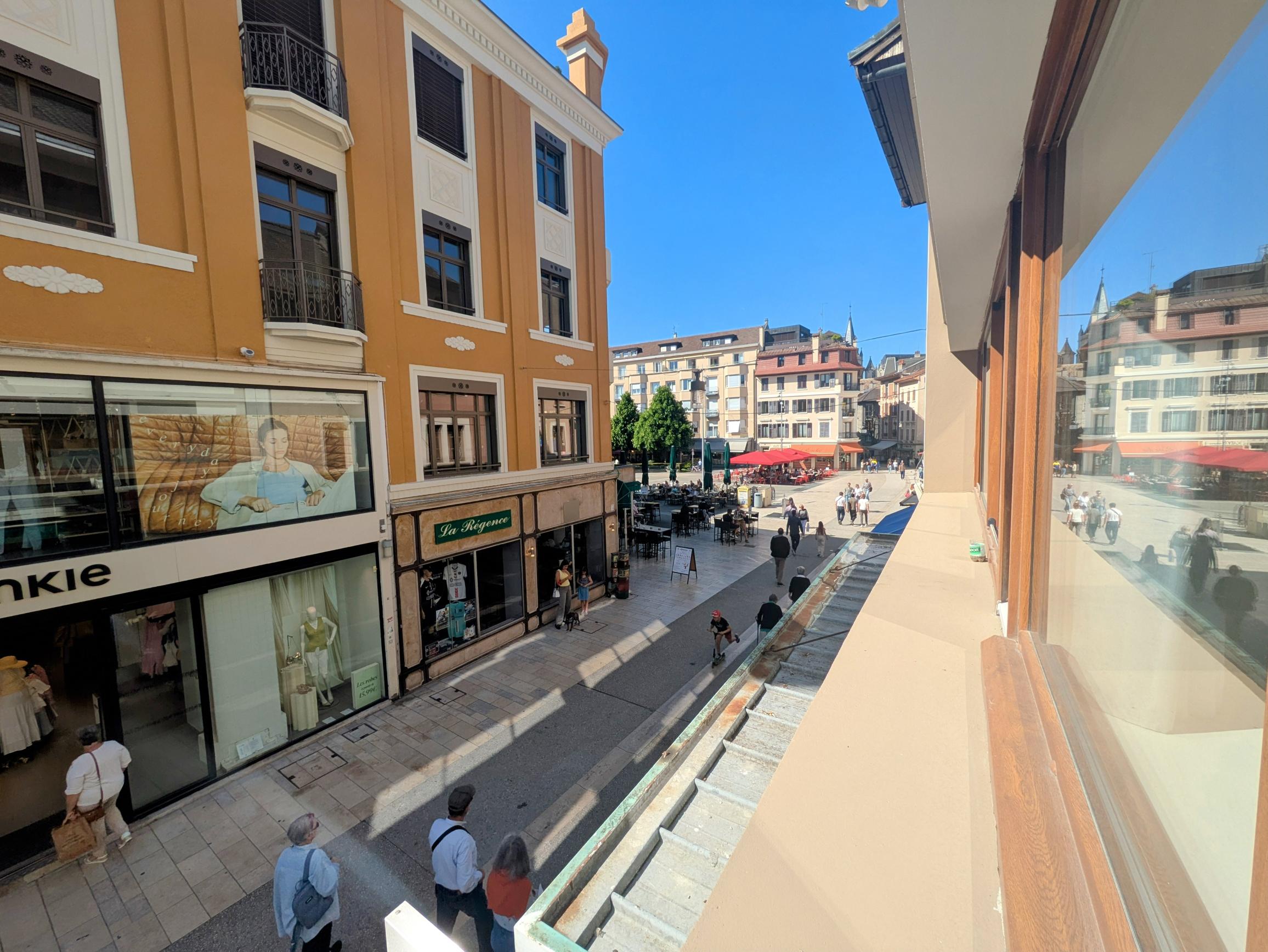 En plein cœur du centre historique de Thonon-les-Bains, au milieu de la Grand Rue.