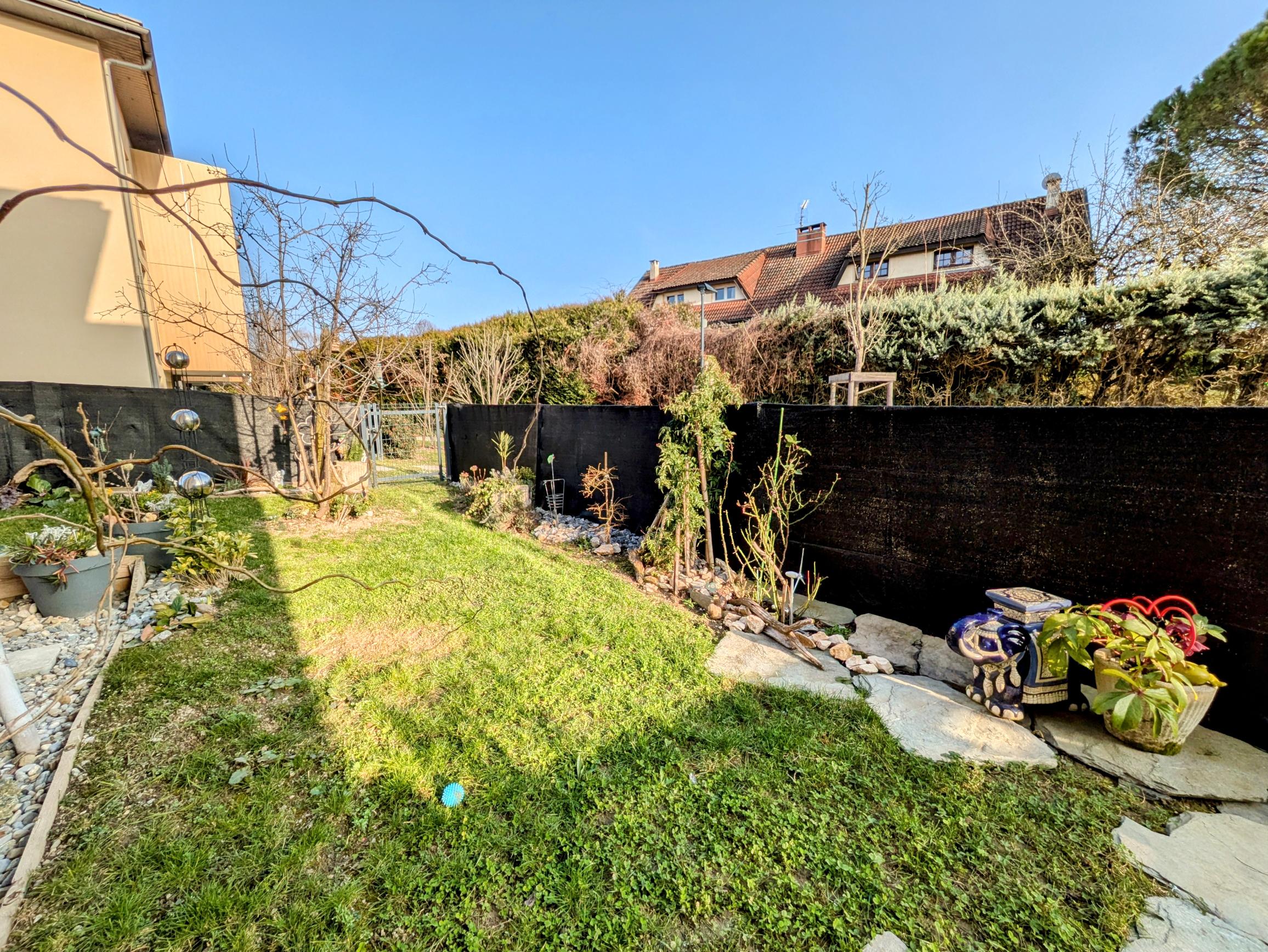 Espace extérieur : Agréable terrasse couverte orientée sud, donnant sur un petit jardin clôturé d’environ 80 m².