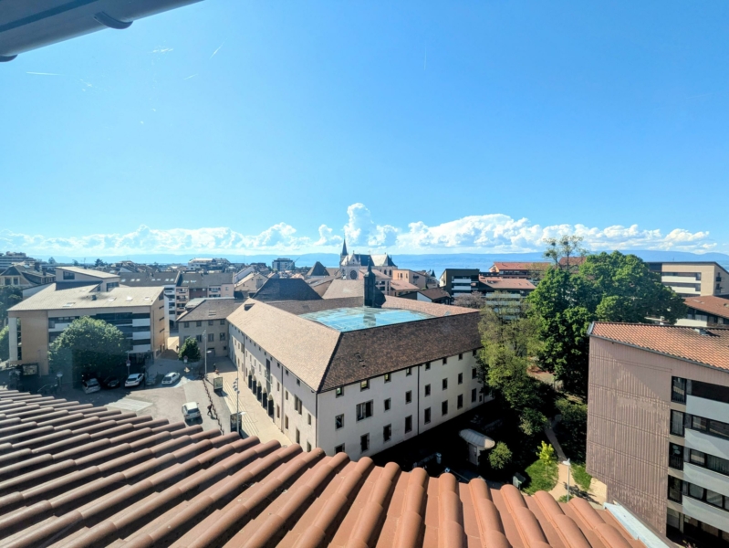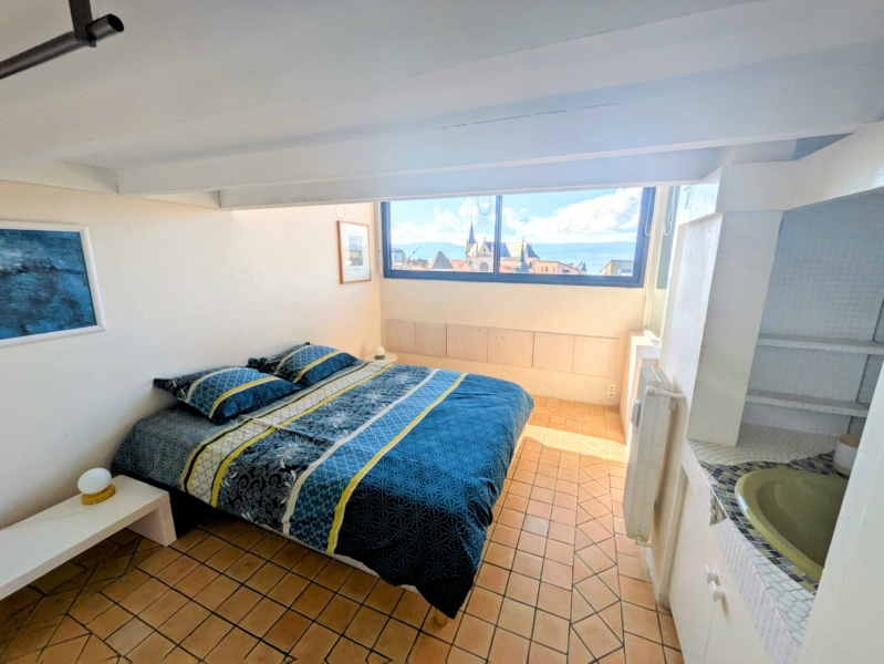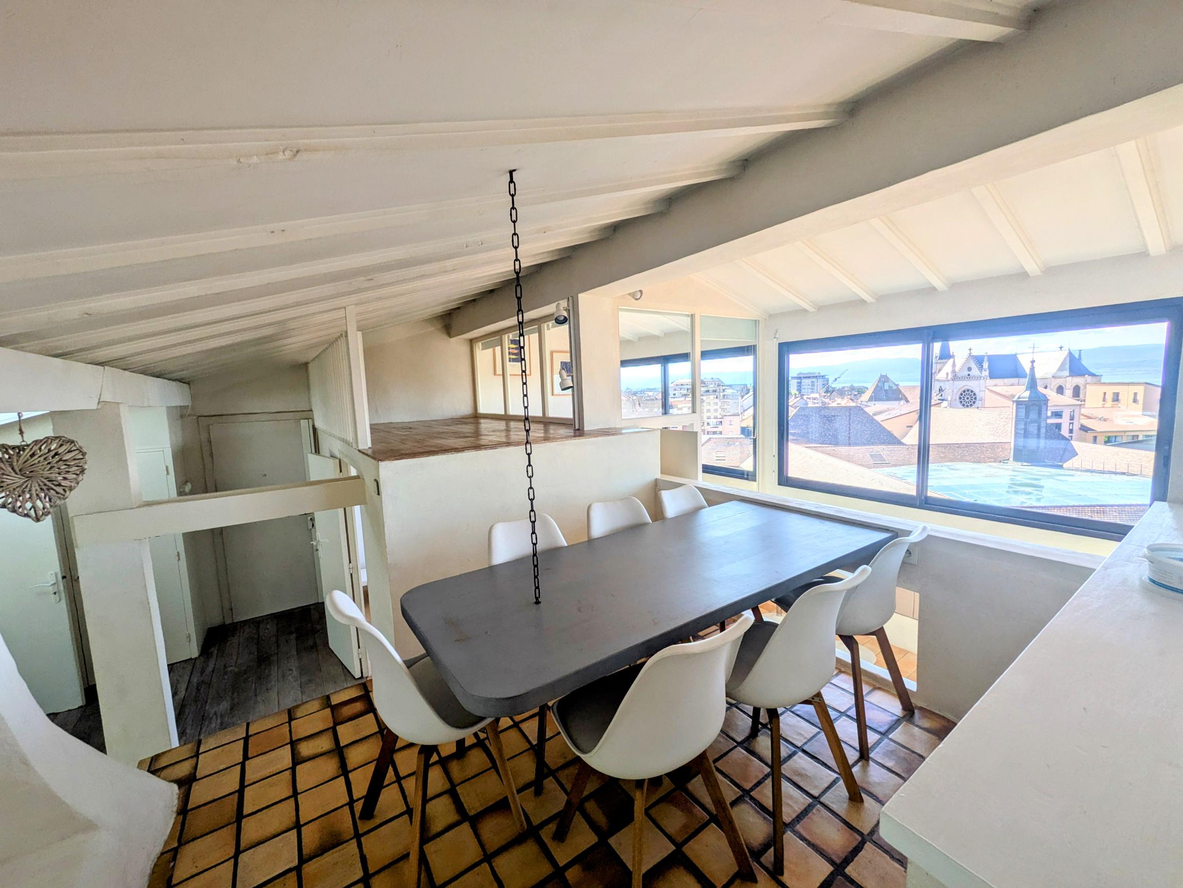 Situé au 7ème et dernier étage en plein cœur de Thonon-les-Bains, ce loft atypique de 59 m² loi Carrez (101 m² au sol) vous séduira par son charme unique et sa vue à couper le souffle sur la ville et le lac Léman.