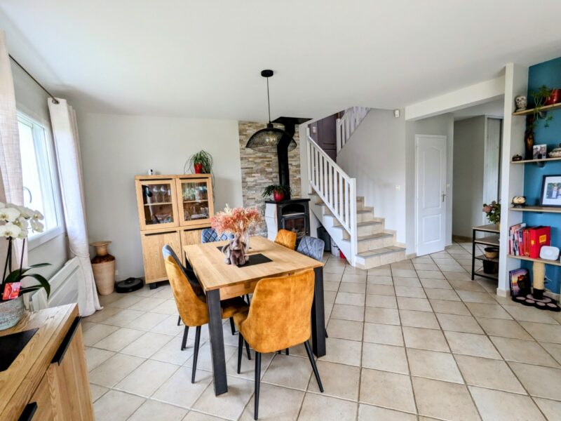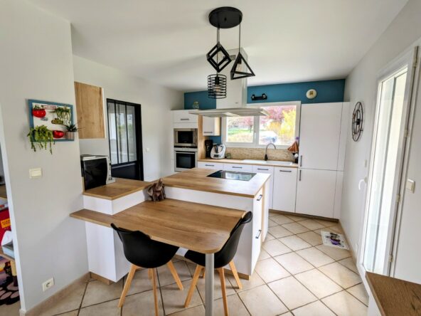 A noter : Pièce à vivre lumineuse de plus de 50m², cuisine neuve (réalisée en 2022), suite parentale, 3 autres chambres et une salle d’eau, chauffage électrique au sol + poêle à bois, un garage double + une place de parking couverte, piscine chauffée par pompe à chaleur (réalisée en 2021), terrasse couverte et un cabanon de jardin.