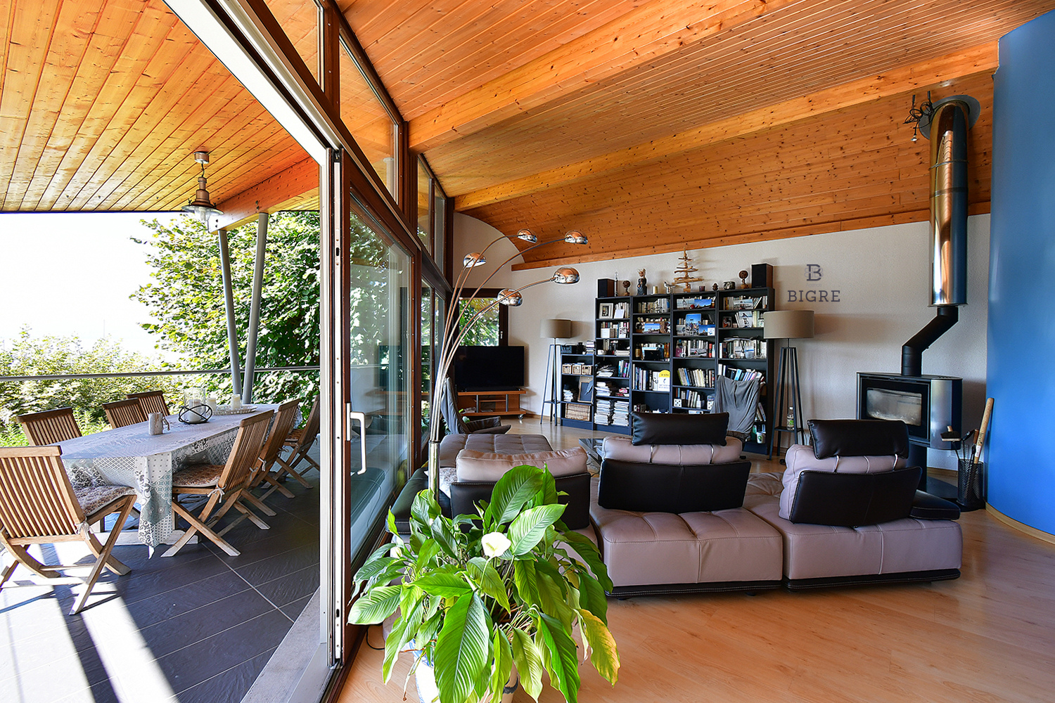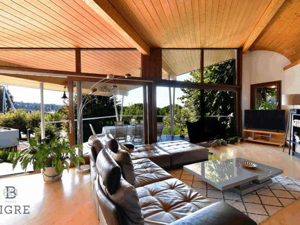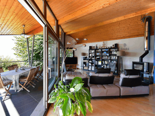 Vous y trouverez un vaste séjour avec poêle à bois, baies vitrées et terrasse panoramique sur le lac, une cuisine ouverte et un espace salle à manger offrant un espace de vie tourné vers l’extérieur.