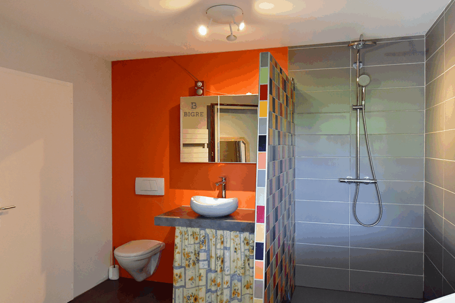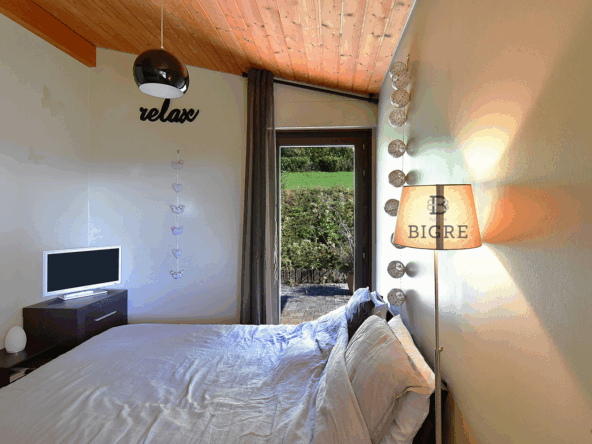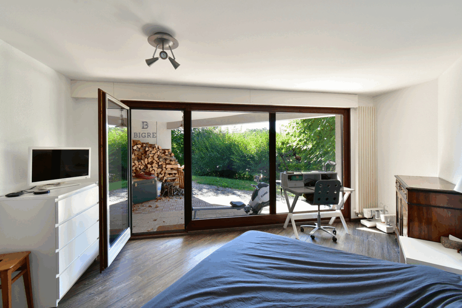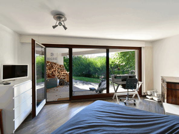 L’espace nuit en rez-de-jardin comprend deux chambres lumineuses avec accès direct à la terrasse Sud et au jardin, ainsi qu’une salle de bain.